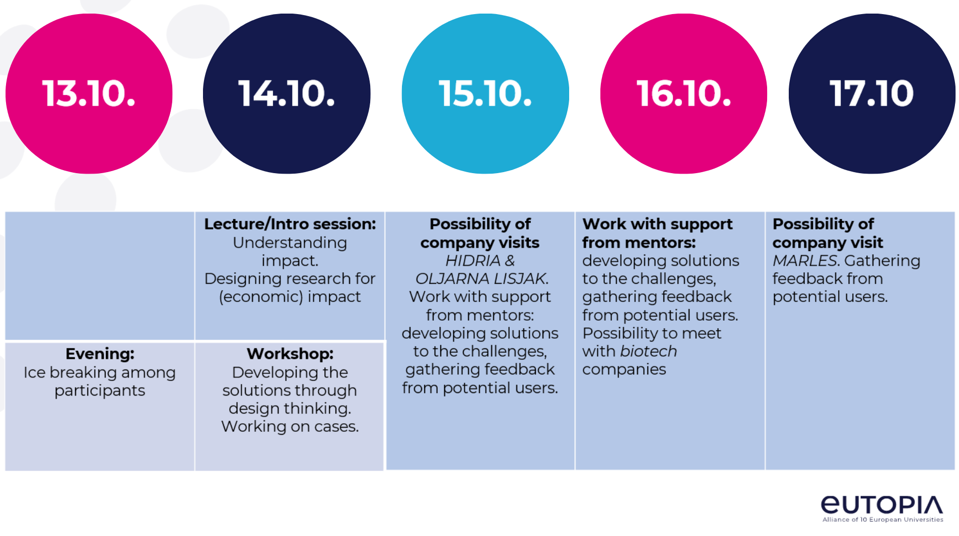 This 4-days training programme will be organised in close connection to Slovenia's Science and Innovation Festival UNI.MINDS, connecting researchers and industry and provide ample opportunities for meeting companies of all sizes, including start-ups and fellow researchers from Eutopia Universities.