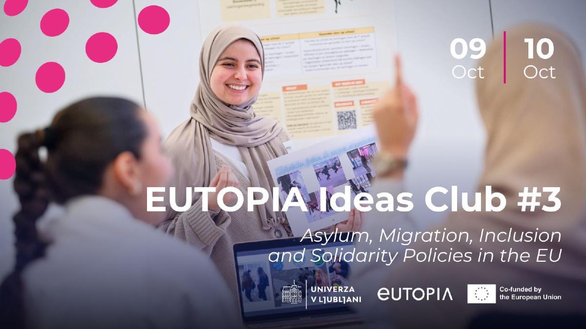 The next EUTOPIA Ideas Club will be held at the University of Ljubljana on 9-10 October 2025. The event will explore the topics of asylum policy, migration, inclusion, and solidarity in the European Union. A participatory methodology will be used, through activities such as a simulation of negotiation on the EU migration and asylum policy and a debate on solidarity and inclusion.