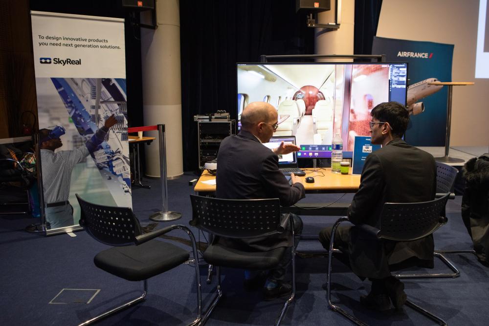 Landing in Paris for the first time on the 6th of December, I had embarked on quite the adventure: my flight – British Airways – was postponed by a few hours and transport halted at Charles de Gaulle Airport. I reached in time for the start of the conference and also got to know the airport like the back of my hand. Scanning my visitor card at the Air France HQ and entering the tarmac-facing conference hall, I felt the infectious buzz in the room – excited to learn from 26+ innovative organisations in the hall & share our proposals with the 100+ attendees. Like a kid in a candy shop, I was awestruck. There were a plethora of amazing technologies showcased: from a headhunting app that excluded background information to remove biases, to exoskeleton technology that assists the carrying of heavy loads, a precision-guided industrial robot arm and a reusable cup closed-loop system, to name a few. Though most of the placards were in French, everyone was kind and accommodating in answering my inquisitive questions. One of my favourite demonstrations during the forum was engaging with an AI-enhanced flight simulator. I channelled my inner pilot as I whizzed through the pre-flight checklist…but sadly, that did not qualify me to fly one of the Airbus planes sitting on the tarmac.